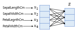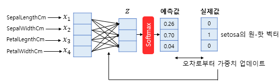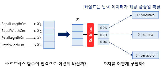 iris 데이터를 이용한 다중 클래스 분류 모델을 만드는 예시이다. 데이터는 4개의 독립변수를 가지는데 이는 모델이 4차원 벡터를 입력으로 받음을 의미한다. 그런데 소프트맥스 함수의 입력으로 사용되는 벡터의 차원은 분류하고자 하는 클래스의 개수가 되어야 하므로 어떤 가중치 연산을 통해 3차원 벡터로 변환되어야 합니다. 위의 그림에서는 소프트맥스 함수의 입력으로 사용되는 3차원 벡터를 z로 표현하였습니다.