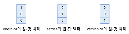 맨 위 그림을 보면 viginica, setosa, versicolor가 1,2,3으로 인코딩된 것을 볼 수 있다. 이에 원-핫 인코딩을 수행하면 virginica는 1로 인코딩 되었기 때문에 첫번째 벡터만 1로 나타냈고, setosa는 2로 인코딩 되었기 떄문에 두번째 벡터만 1로 나타난 것을 알 수 있다.